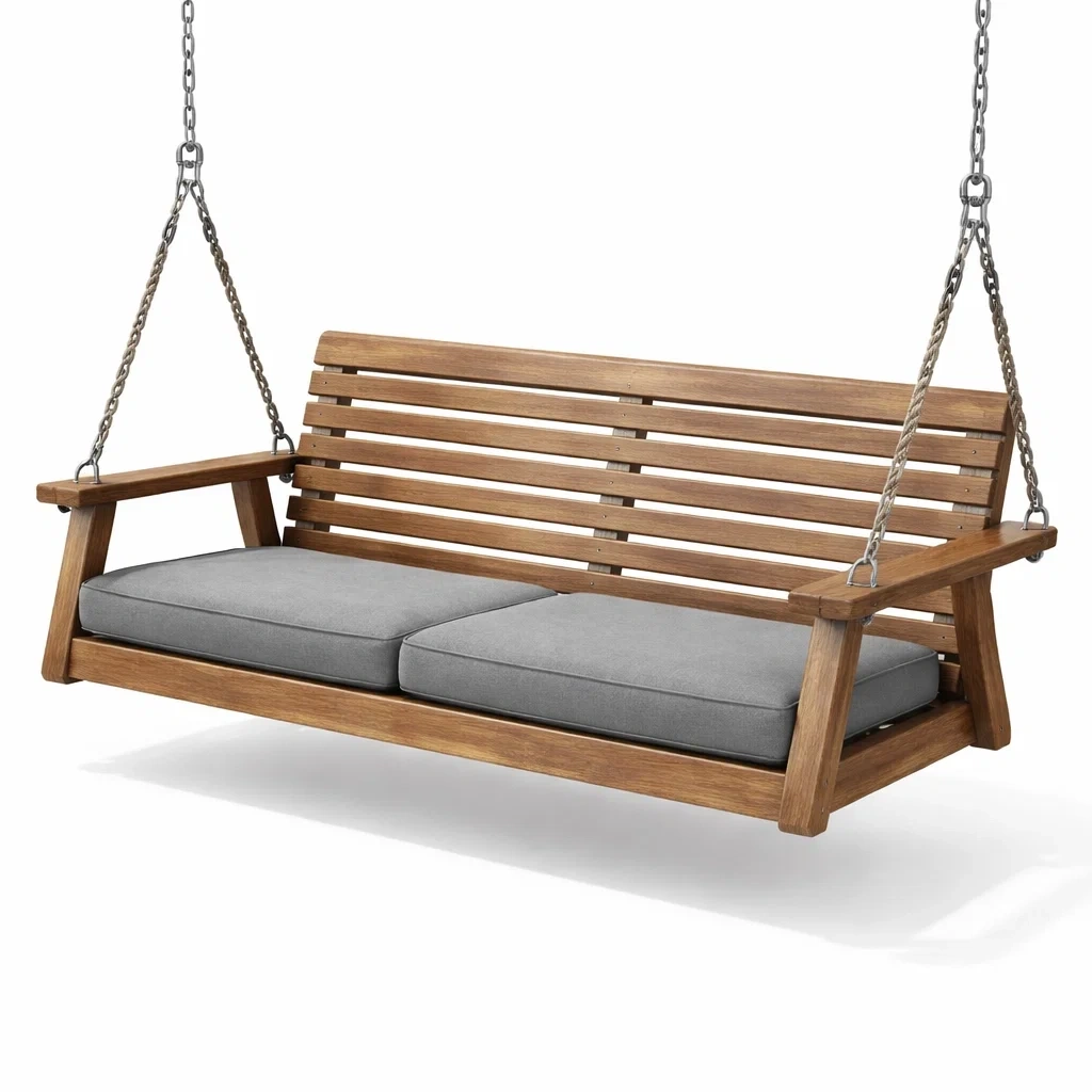 Altalena da veranda da esterno in legno di acacia con cuscino di colore grigio