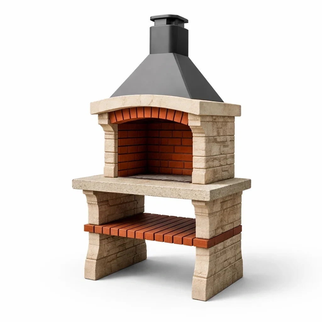 Barbecue da giardino in pietra e mattoni con cappa in metallo