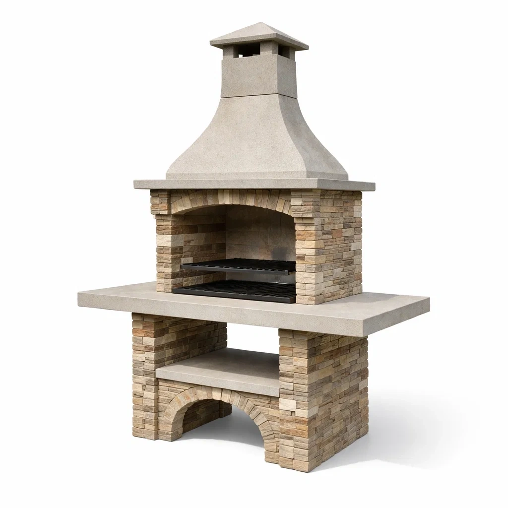 Barbecue in cemento con camino e griglia in acciaio inox per uso esterno
